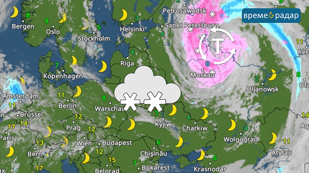 Метеорологичен радар: Циклон се върти близо до Москва и носи продължителен обилен снеговалеж в района.
