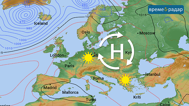 Силен антициклон над Полша и Украйна носи слънчево и необичайно меко пролетно време на много места. От Централна и Източна Европа до Балканите и Гърция небето е почти безоблачно.
