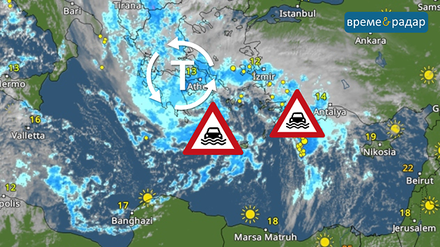 Причината е система с ниско налягане в Егейско море, която е обогатена с влага благодарение на топлото Средиземно море. Циклонът носи не само валежи, но и бури.