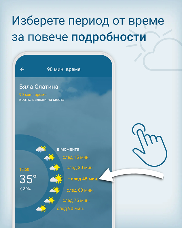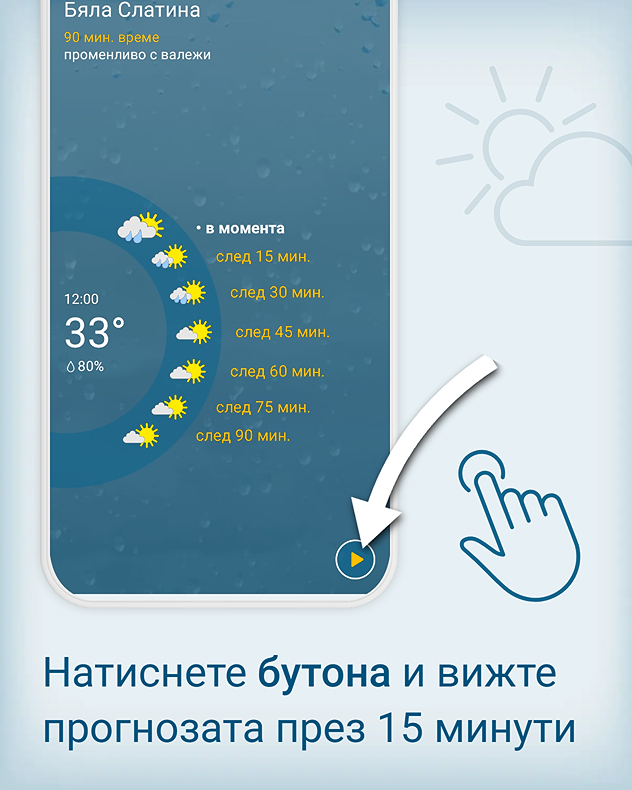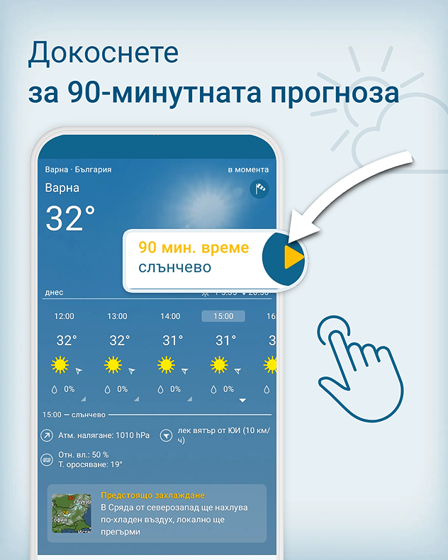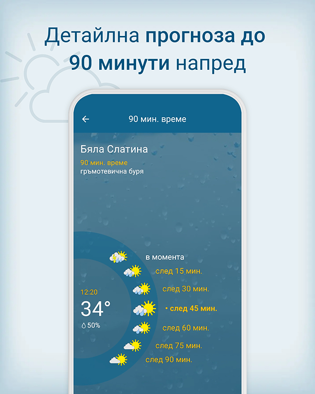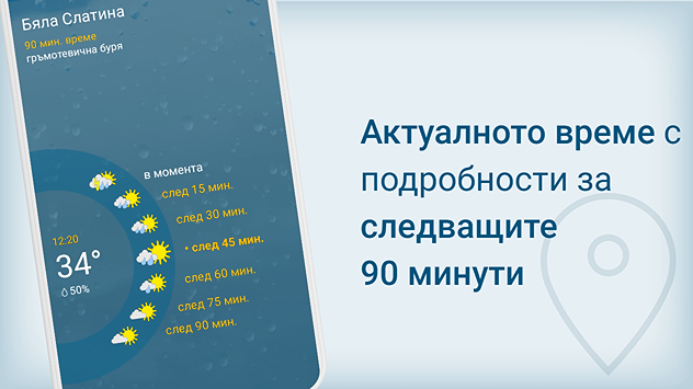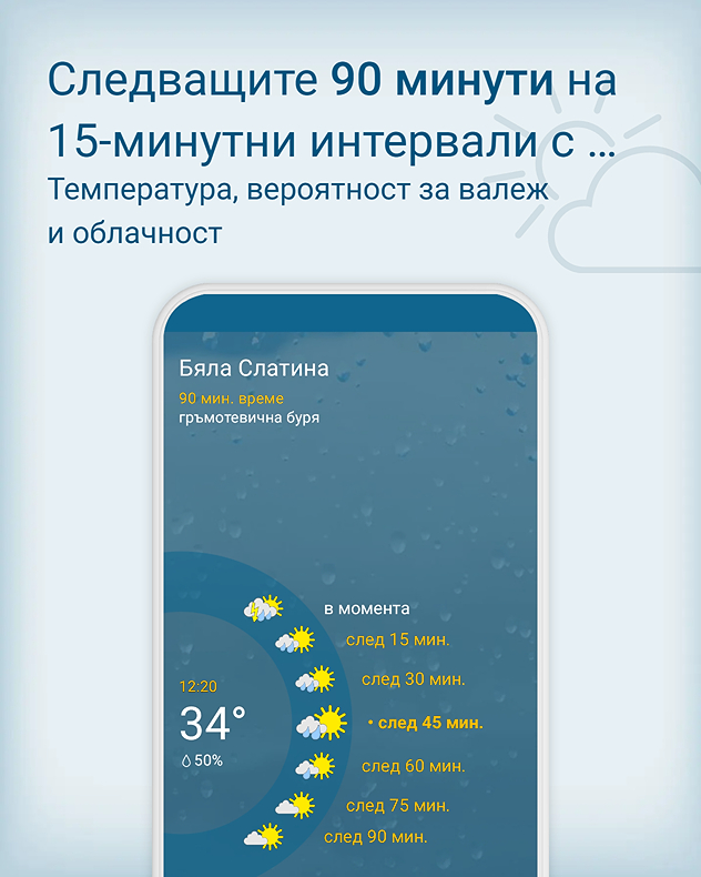 Имате нужда от прогноза на всеки 15 минути? Имаме функция в приложението „Време и радар“ точно за това. Получавайте бърза прогноза на всеки четвърт час и до 90 минути напред, където и да сте.