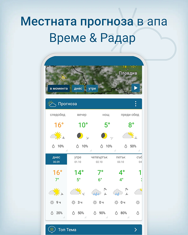 Планирате велосипедна обиколка или искате да знаете дали приятелите ви в Майорка се пекат на слънце? С местната прогноза в приложението Време & Радар можете да проверите времето навсякъде по света само с едно докосване.
