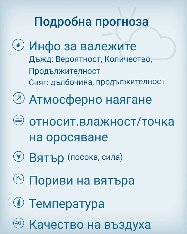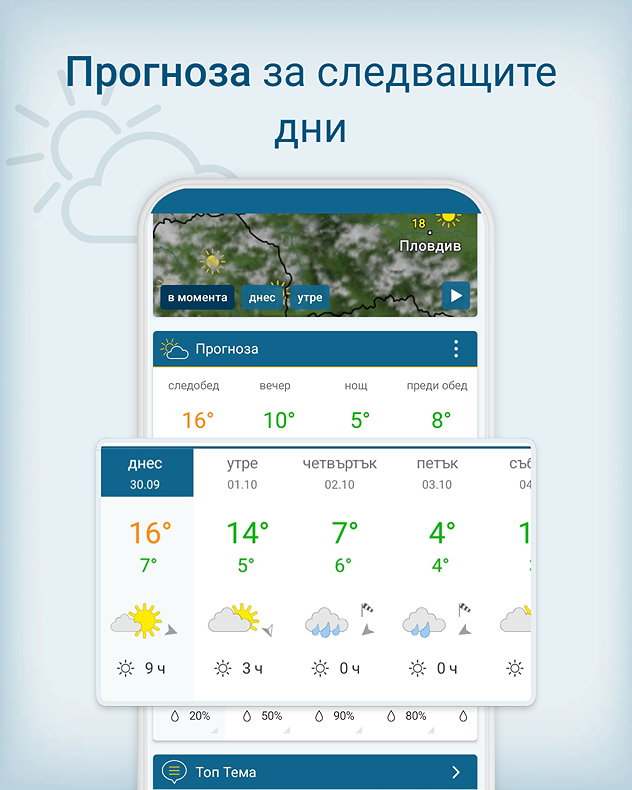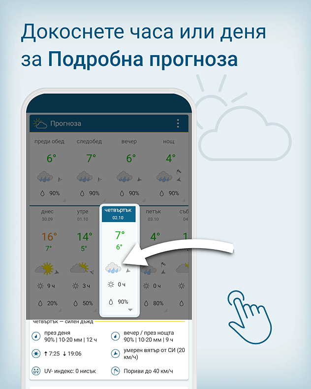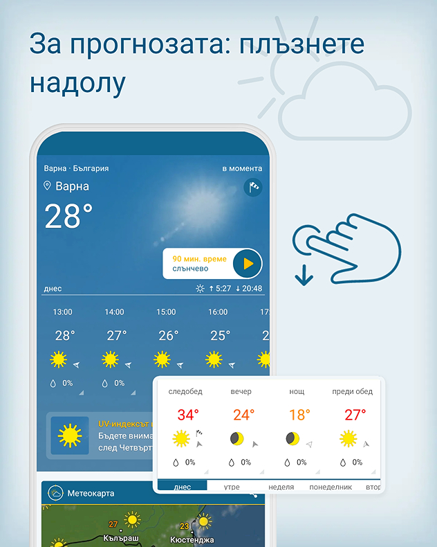 Нашата точна прогноза предоставя подробна информация за слънце, вятър и дъжд – за вашето текущо местоположение или за всяко друго място по света, което изберете.